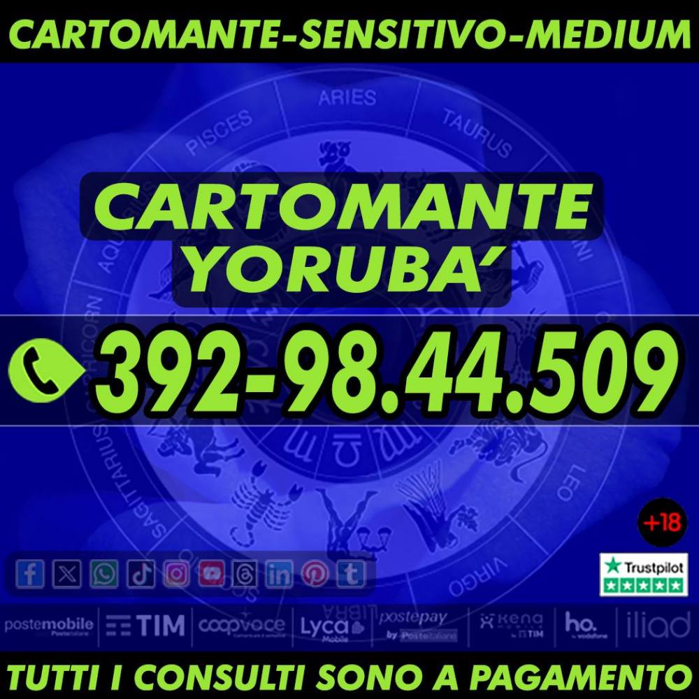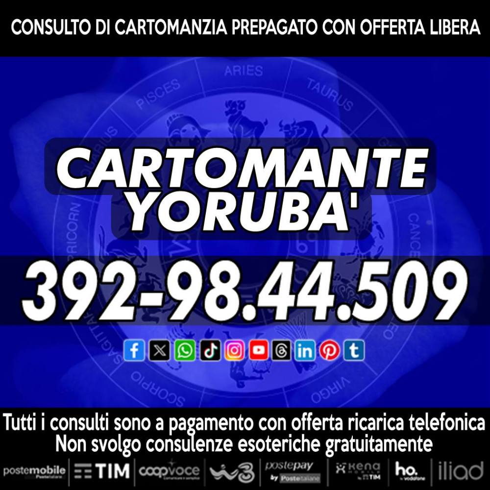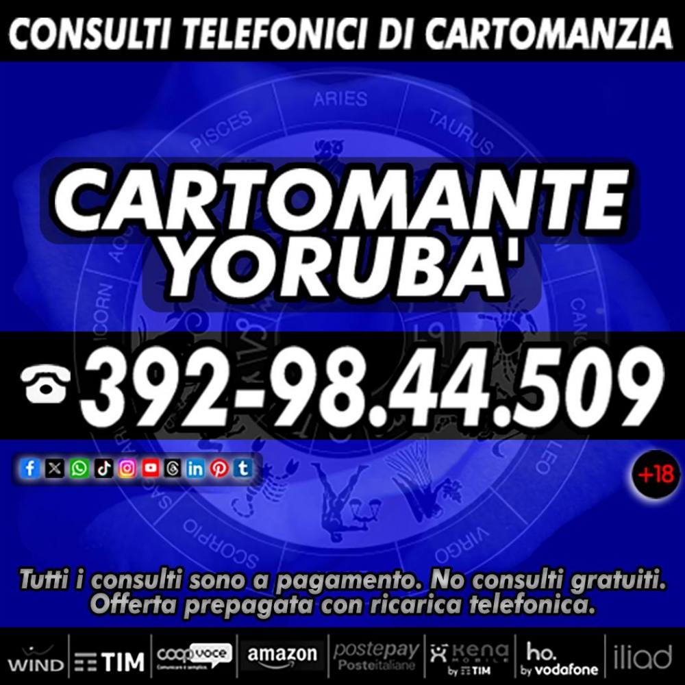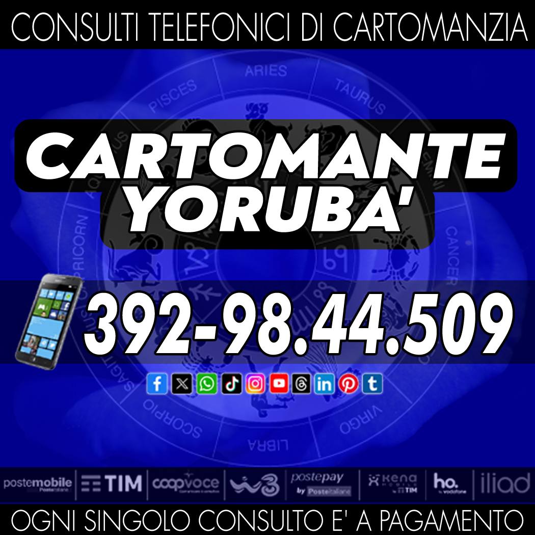 Aiuti & Consigli per il tuo rapporto d'amore, per il tuo lavoro, per la tua famiglia, per i tuoi affari, per la tua fortuna in generale. Consulta il Cartomante Yorubà, Yorubà chiederà ai Tarocchi che cosa ti aspetta per il futuro. Per il Cartomante Yorubà fare i consulti è pane quotidiano. I consulti sono accessibili a tutti e sono a basso costo con offerta libera con ricarica telefonica. Consulto solo ed esclusivamente i Tarocchi, le carte del nostro destino, che indicano il presente, il passato e, soprattutto, il futuro. Chiama il numero di cellulare che visualizzi nella foto in allegato, puoi chiamare tutti i giorni dalle ore 9 alle 21. 30 minuti per te.